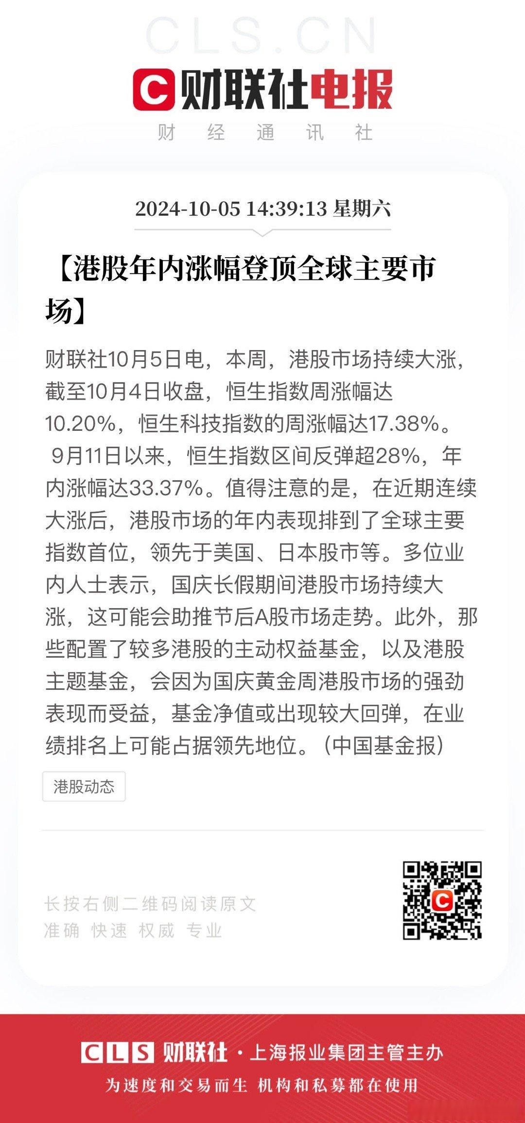 财联社10月5日电,本周,港股市场持续大涨,截至10月4日收盘,恒生指数周涨幅达10.20%,恒生科技指数的周涨幅达17.38%。